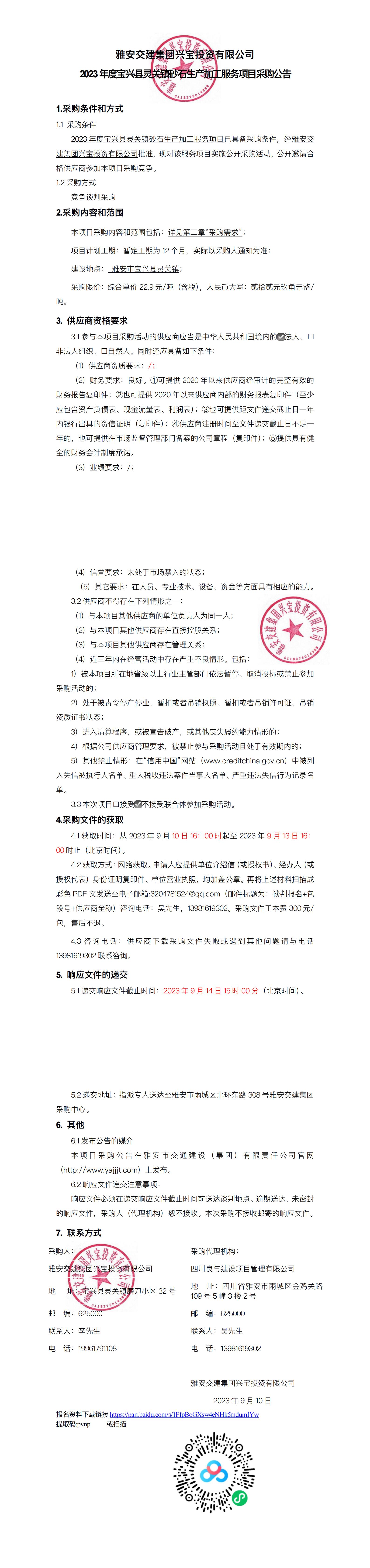 雅安交建集團興寶投資有限公司2023年度寶興縣靈關鎮(zhèn)砂石生產加工服務項目采購公告