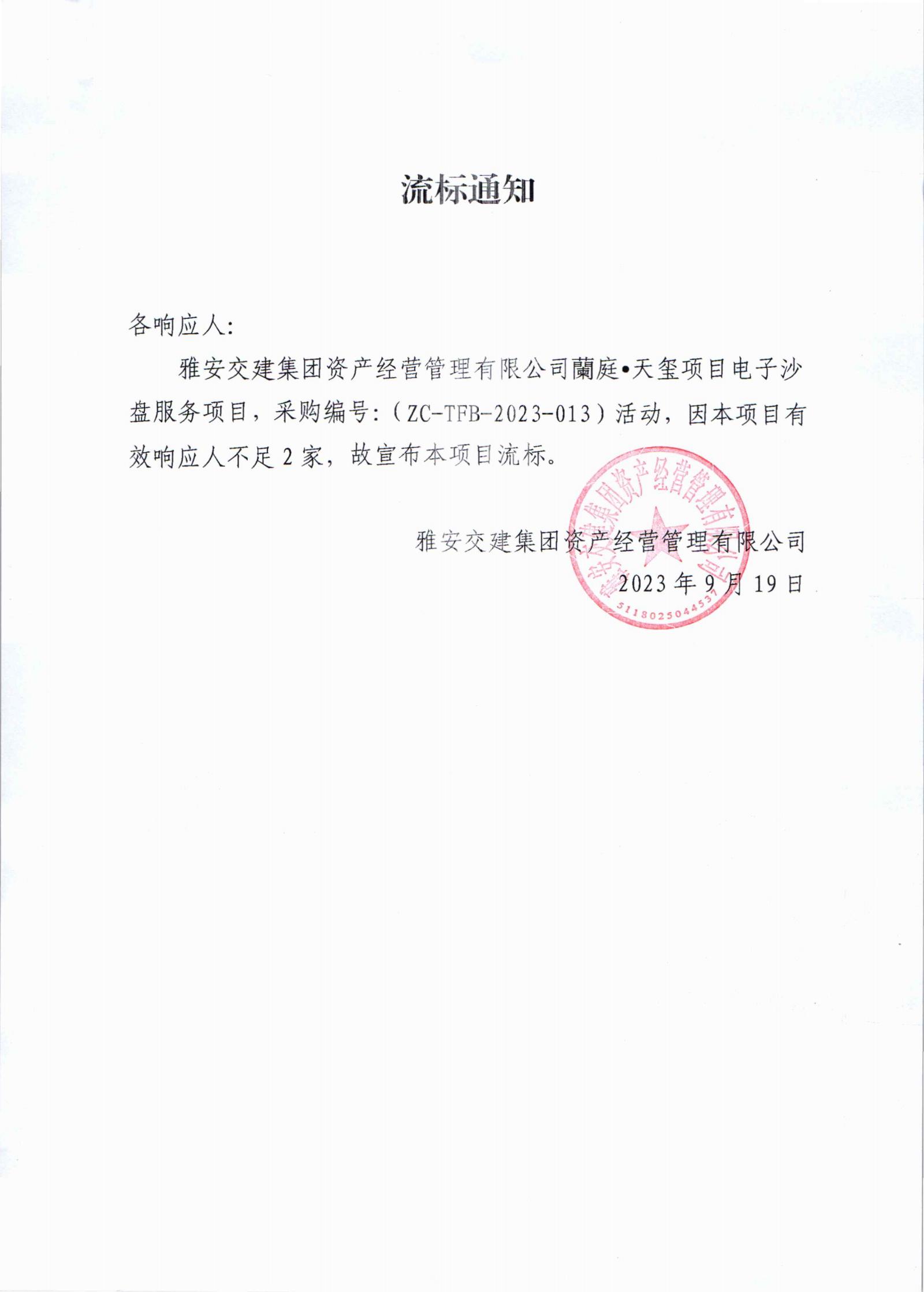 雅安交建集團資產經營管理有限公司蘭庭•天璽項目電子沙盤服務項目流標通知書