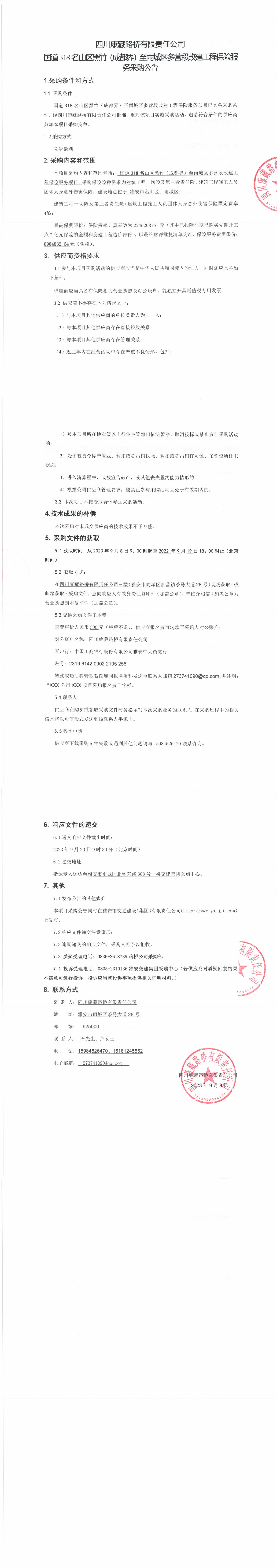 四川康藏路橋有限責任公司國道318名山區(qū)黑竹(成都界)至雨城區(qū)多營段改建工程保險服務采購公告