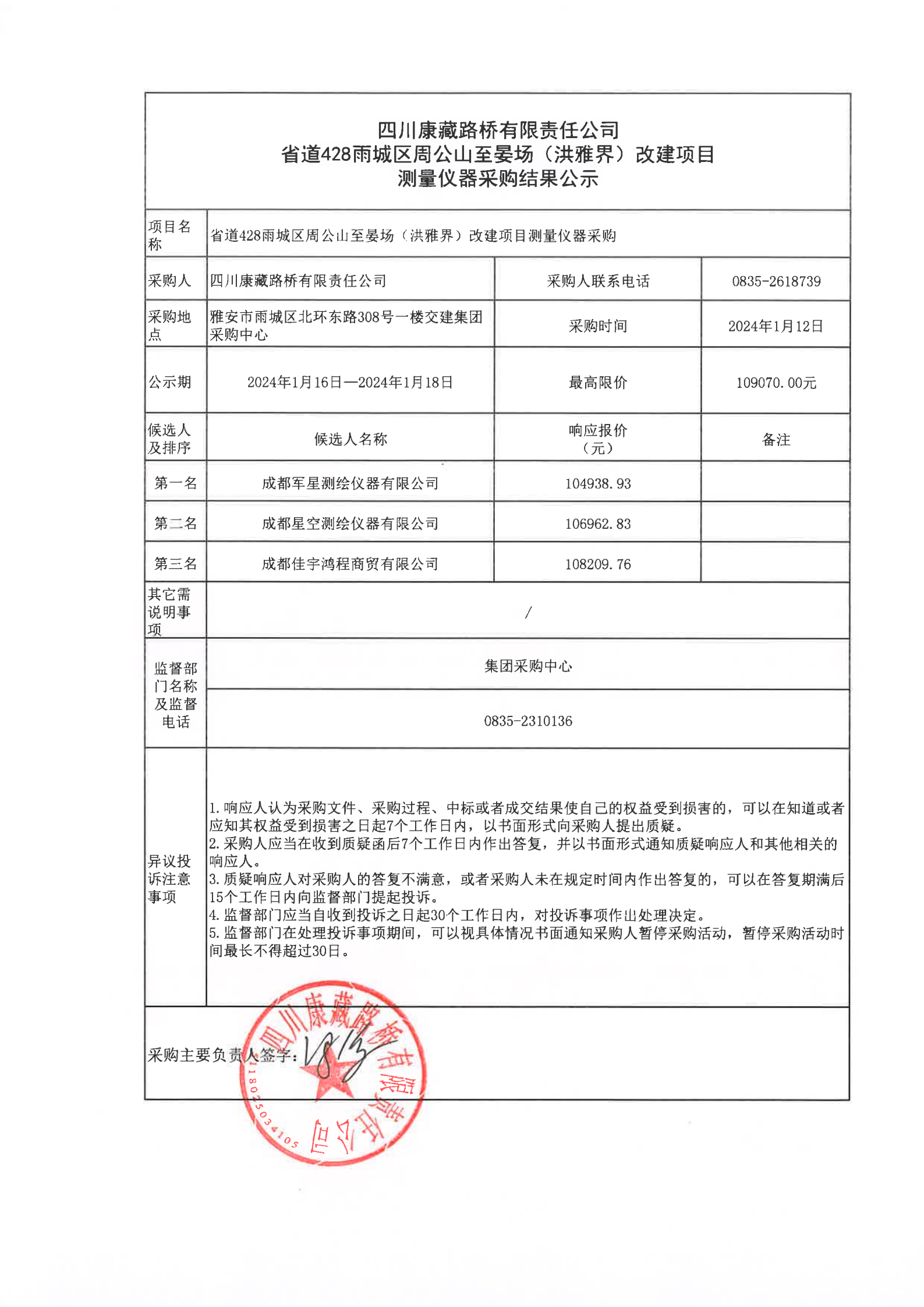 四川康藏路橋有限責(zé)任公省道428雨城區(qū)周公山至晏場(chǎng)(洪雅界)改建項(xiàng)目測(cè)量?jī)x器采購(gòu)結(jié)果公示