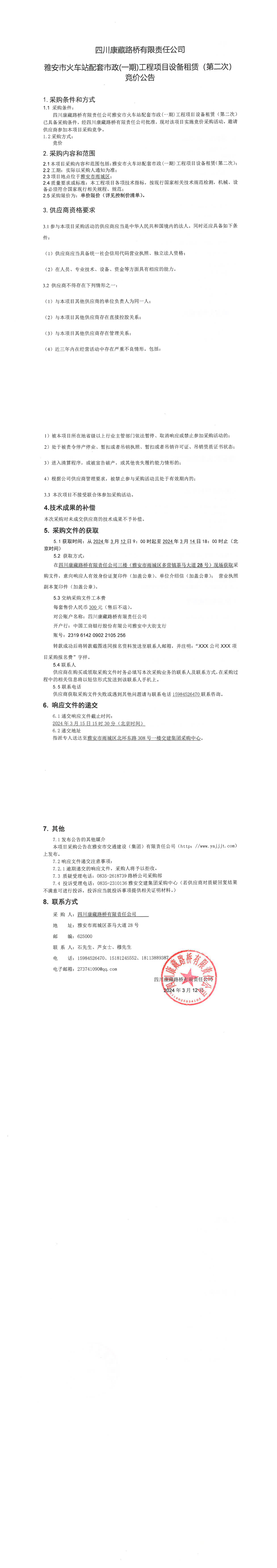 四川康藏路橋有限責(zé)任公司雅安市火車站配套市政(一期)工程項目設(shè)備租賃(第二次)競價公告