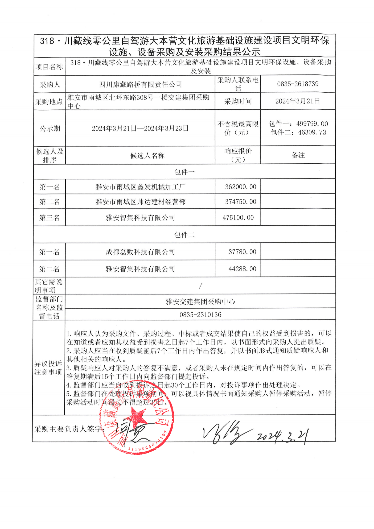 四川康藏路橋有限責(zé)任公司318·川藏線零公里自駕游大本營文化旅游基礎(chǔ)設(shè)施建設(shè)項目文明環(huán)保設(shè)施、設(shè)備采購及安裝采購結(jié)果公示