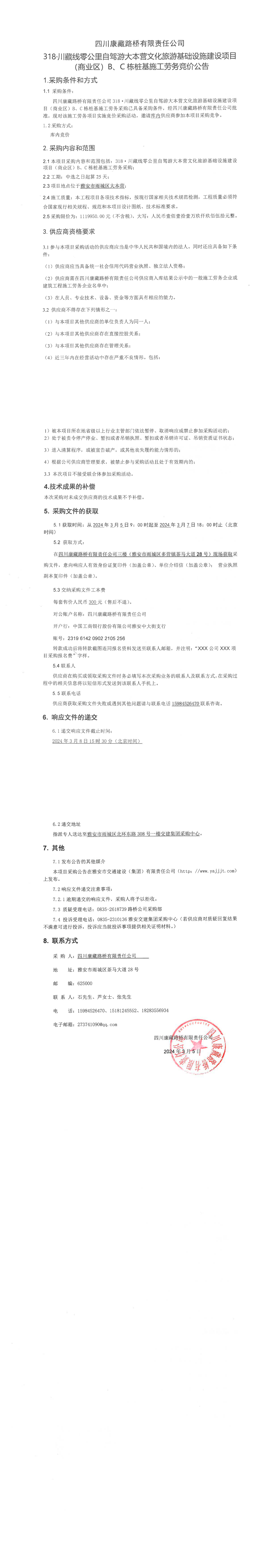 四川康藏路橋有限責(zé)任公司318·川藏公路零公里自駕游大本營文化旅游基礎(chǔ)設(shè)施建設(shè)項(xiàng)目(商業(yè)區(qū))B\C棟樁基施工勞務(wù)競價(jià)公告