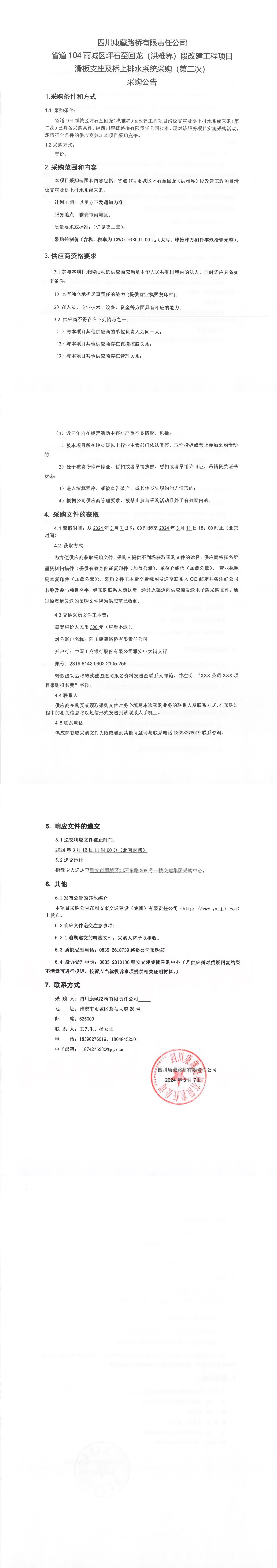 四川康藏路橋有限責任公司省道104雨城區(qū)坪石至回龍(洪雅界)段改建工程項目滑板支座及橋上排水系統(tǒng)流采購標通知