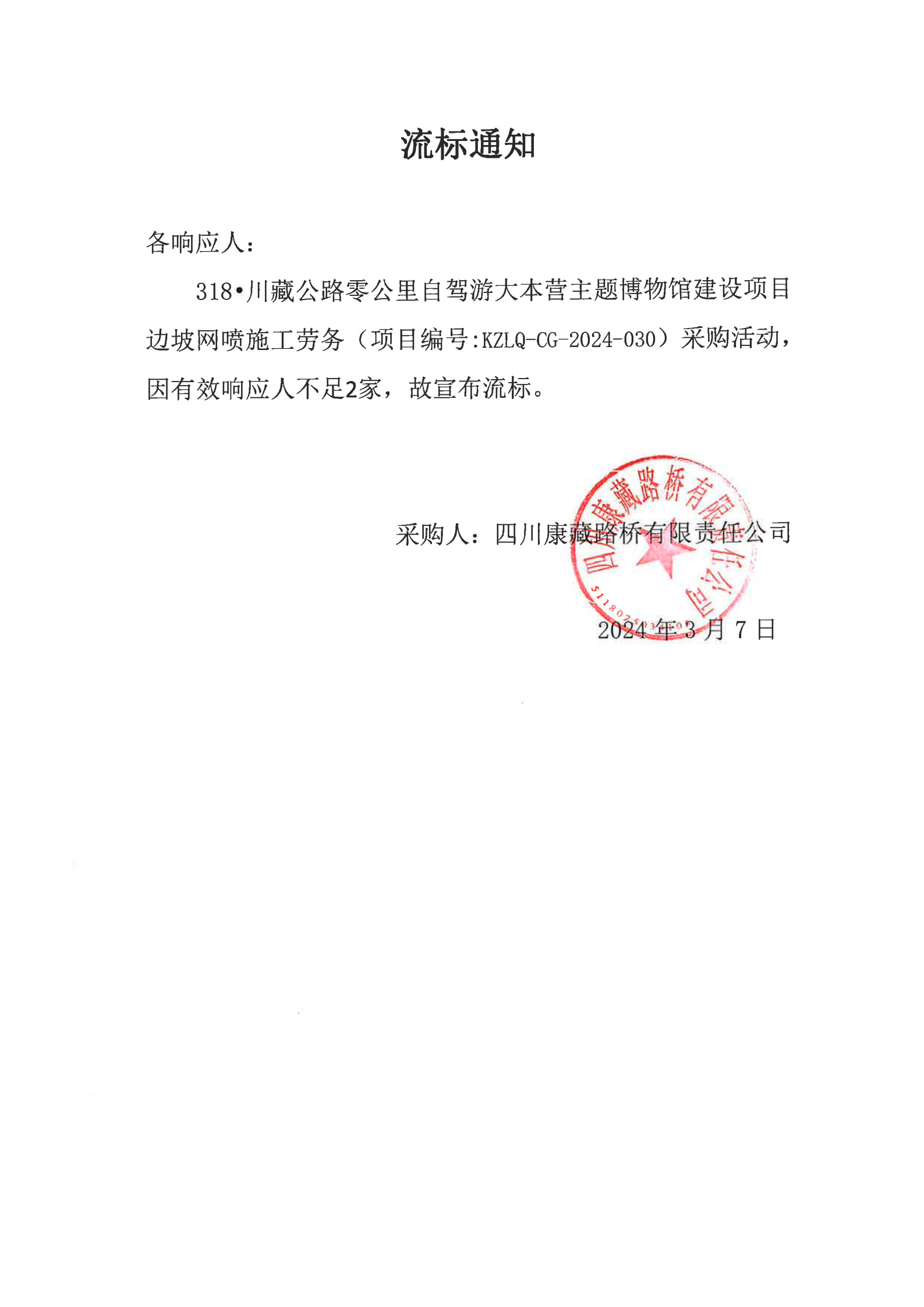 四川康藏路橋有限責(zé)任公司318·川藏公路零公里自駕游大本營主題博物館建設(shè)項(xiàng)目邊坡網(wǎng)噴施工勞務(wù)流標(biāo)通知