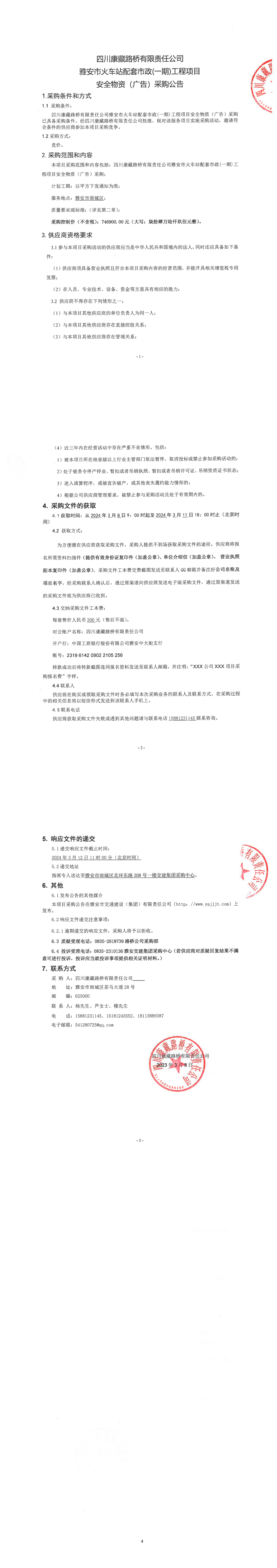 四川康藏路橋有限責(zé)任公司雅安市火車(chē)站配套市政(一期)工程項(xiàng)目安全物質(zhì)(廣告)采購(gòu)公告