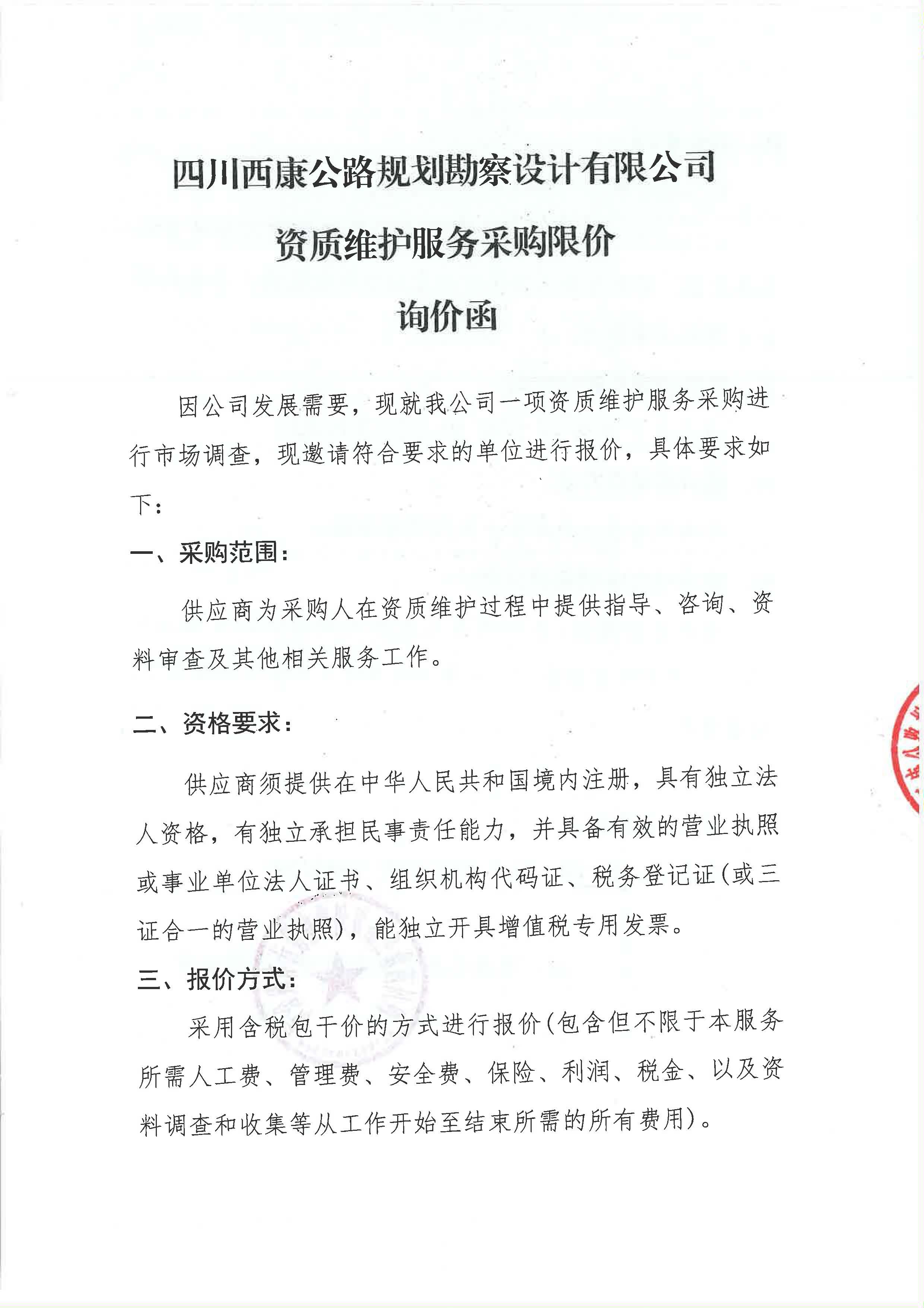 四川西康公路規(guī)劃勘察設(shè)計(jì)有限公司資質(zhì)維護(hù)服務(wù)采購限價(jià)詢價(jià)函