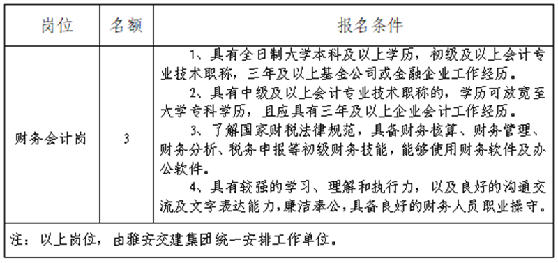 雅安市交通建設(shè)(集團(tuán))有限責(zé)任公司所屬子公司財務(wù)人員招聘公告
