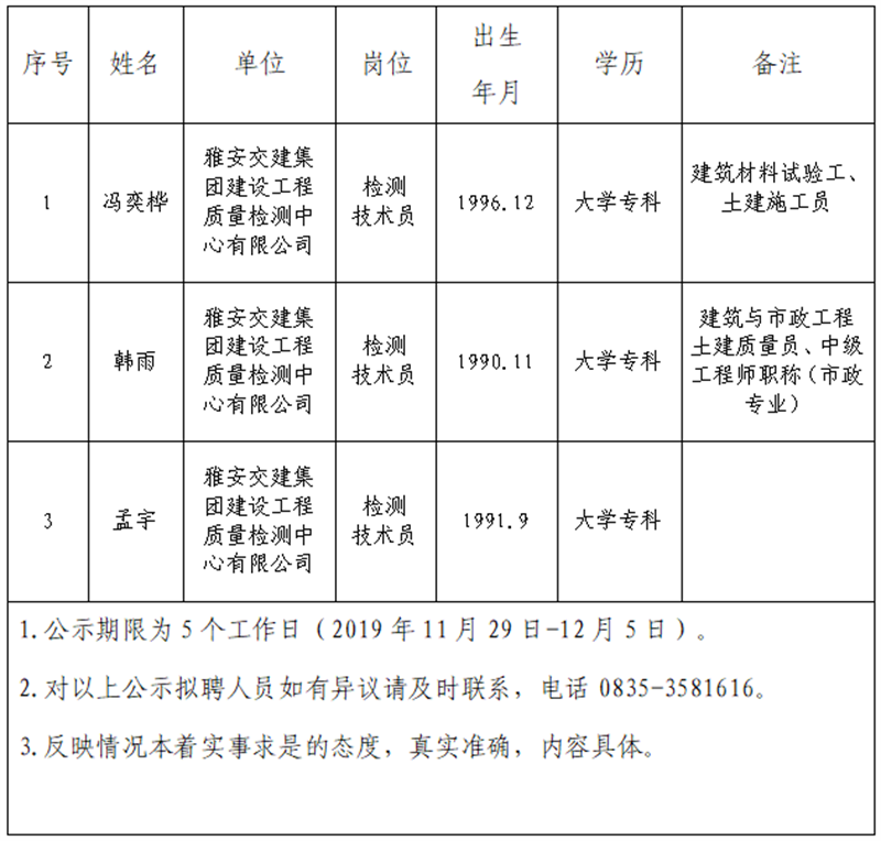 雅安交建集團(tuán)子公司擬聘用人員公示(檢測(cè)中心)