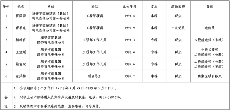 雅安交建集團(tuán)子公司擬聘用人員公示(路橋公司、第一分公司)