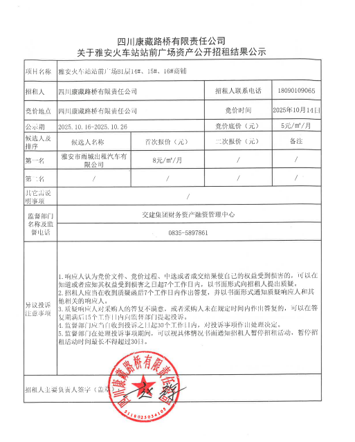 四川康藏路橋有限責任公司關(guān)于雅安火車站站前廣場資產(chǎn)公開招租結(jié)果公示
