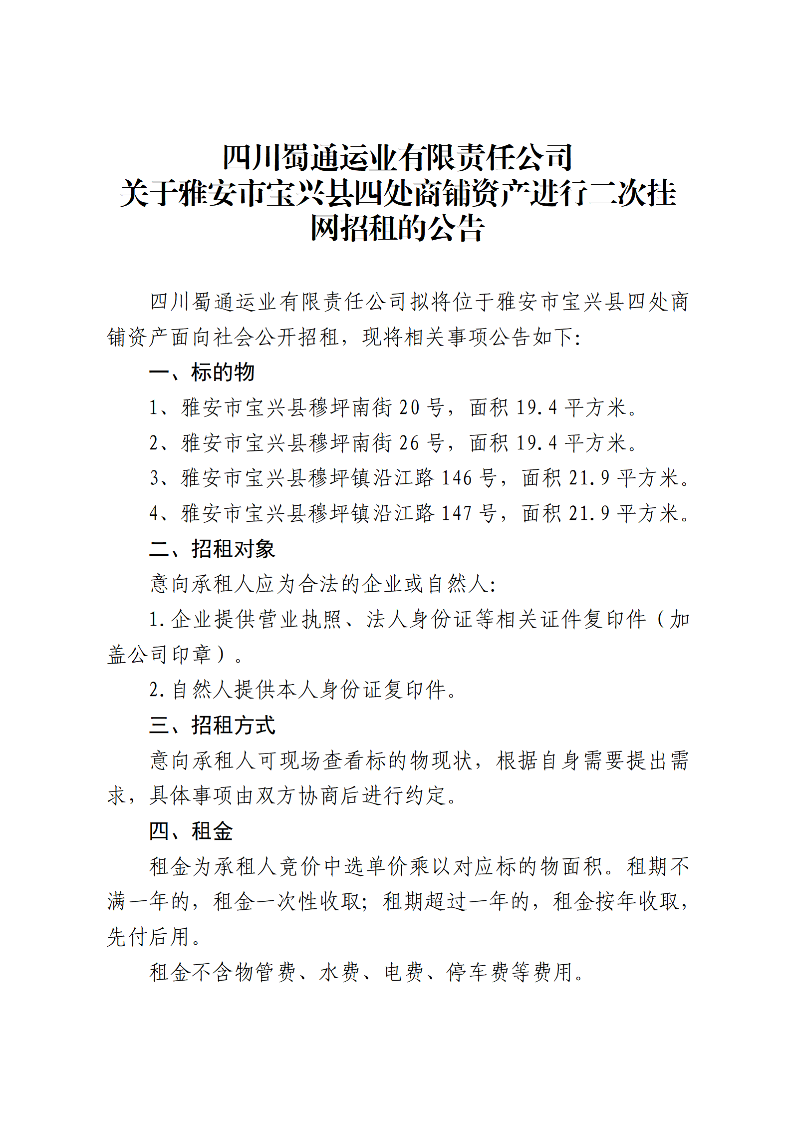 四川蜀通運業(yè)有限責任公司 關于雅安市寶興縣四處商鋪資產進行二次掛網招租的公告