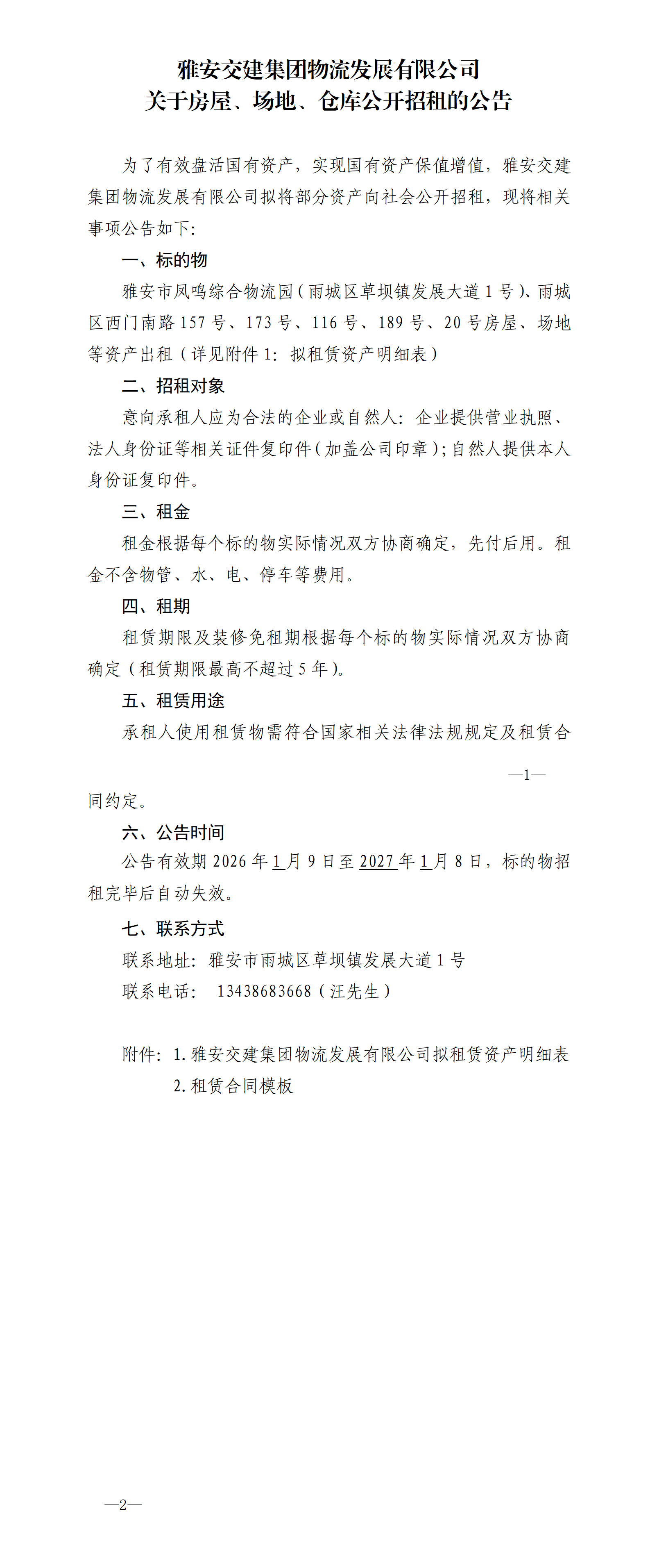 雅安交建集團(tuán)物流發(fā)展有限公司關(guān)于房屋、場(chǎng)地、倉庫公開招租的公告