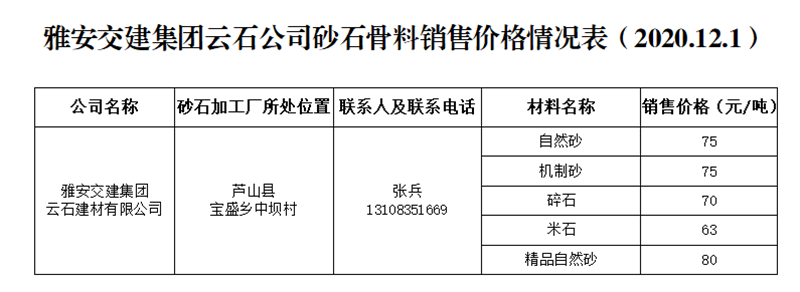 雅安交建集團(tuán)云石公司砂石骨料銷(xiāo)售價(jià)格情況表(2020.12.1)