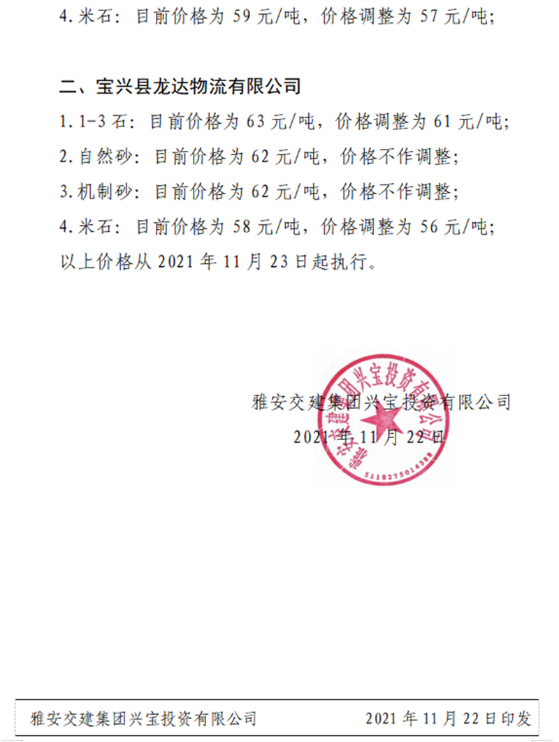 雅安交建集團(tuán)興寶公司關(guān)于調(diào)整成品料銷售價(jià)格的通知(2021.11.26)