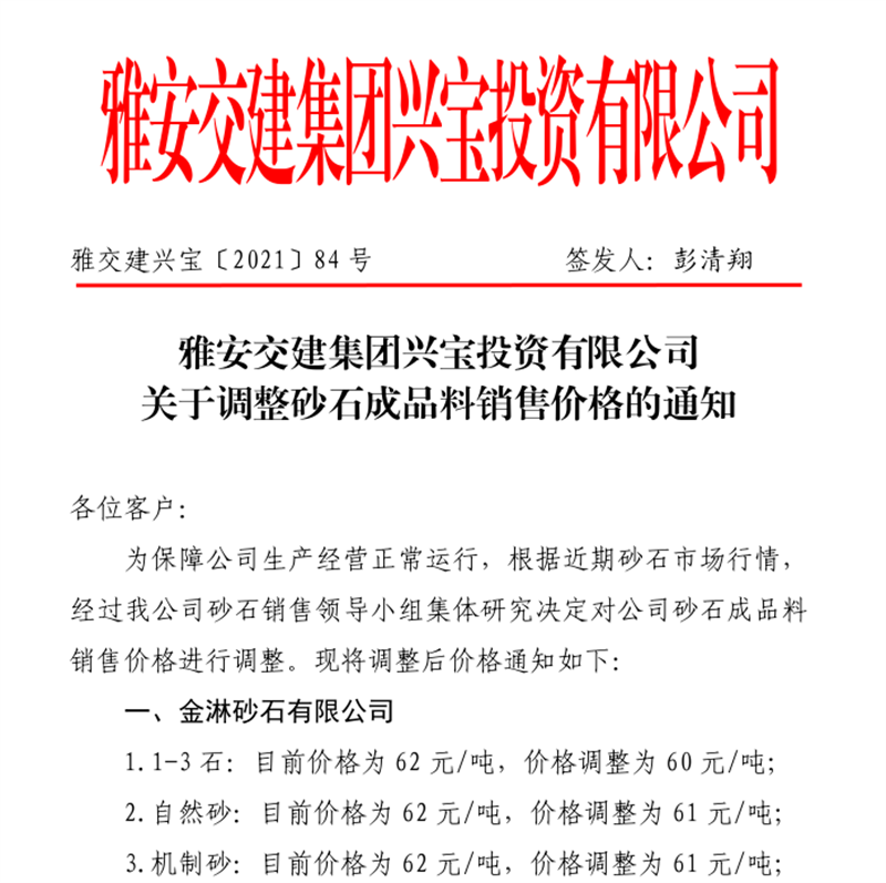 雅安交建集團(tuán)興寶公司關(guān)于調(diào)整成品料銷售價(jià)格的通知(2021.11.26)