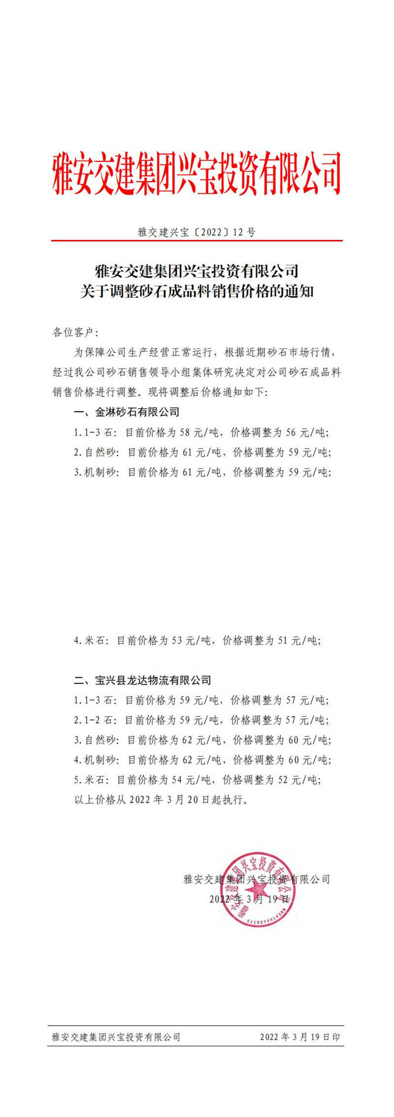 雅安交建興寶公司關于調整砂石成品料銷售價格的通知(2022-3-1)