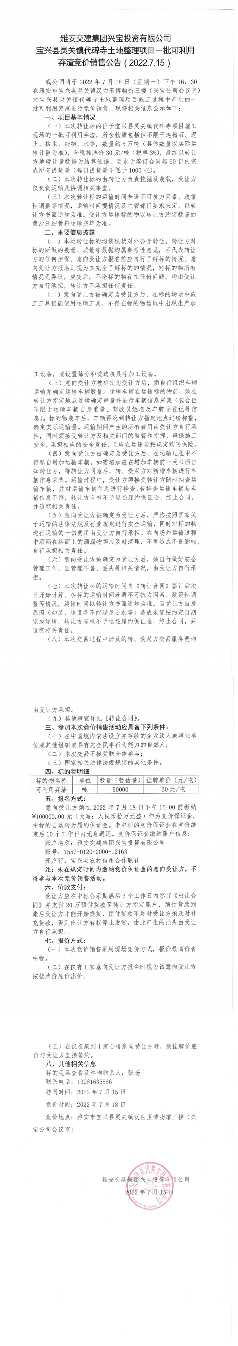 寶興縣靈關(guān)鎮(zhèn)代碑寺土地整理項(xiàng)目一批可利用棄渣競(jìng)價(jià)銷售公告7.15(5萬噸)