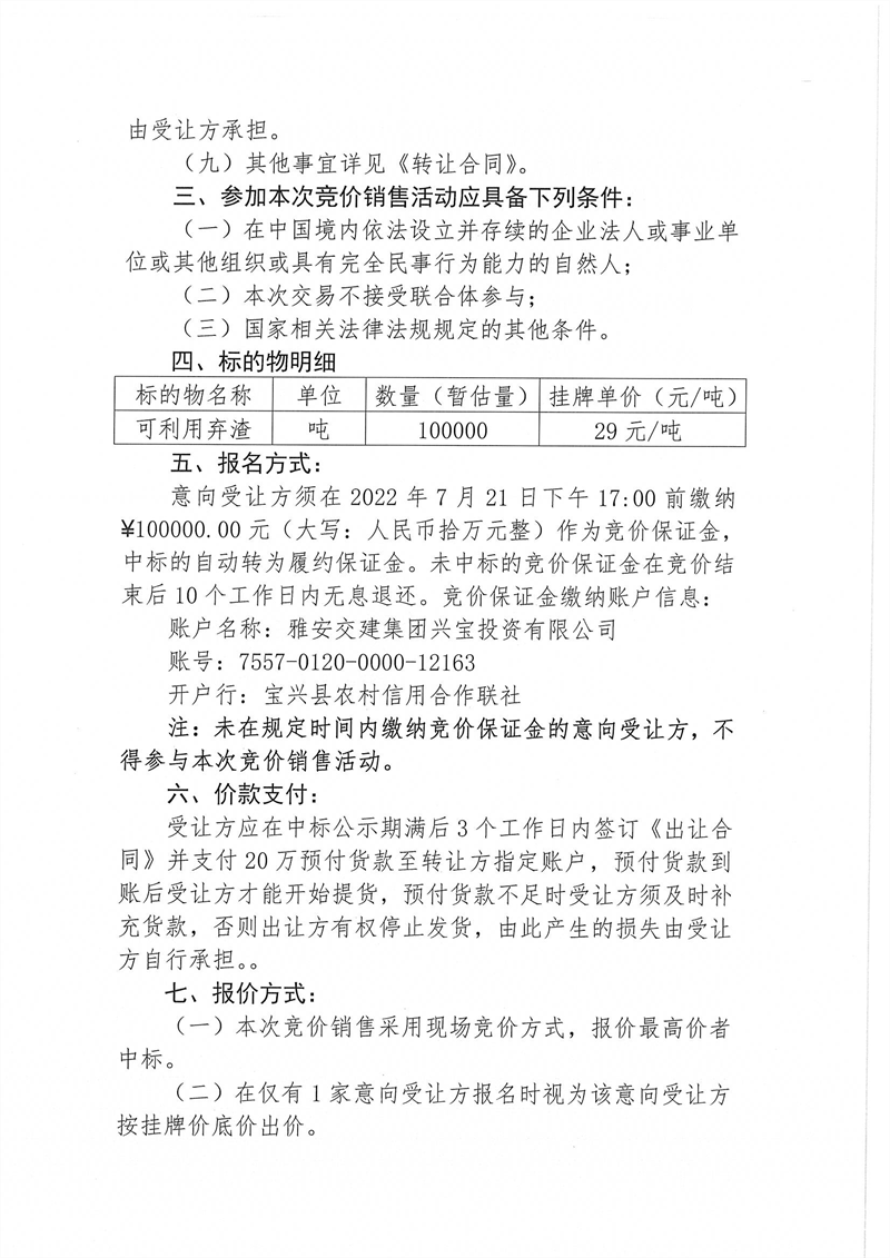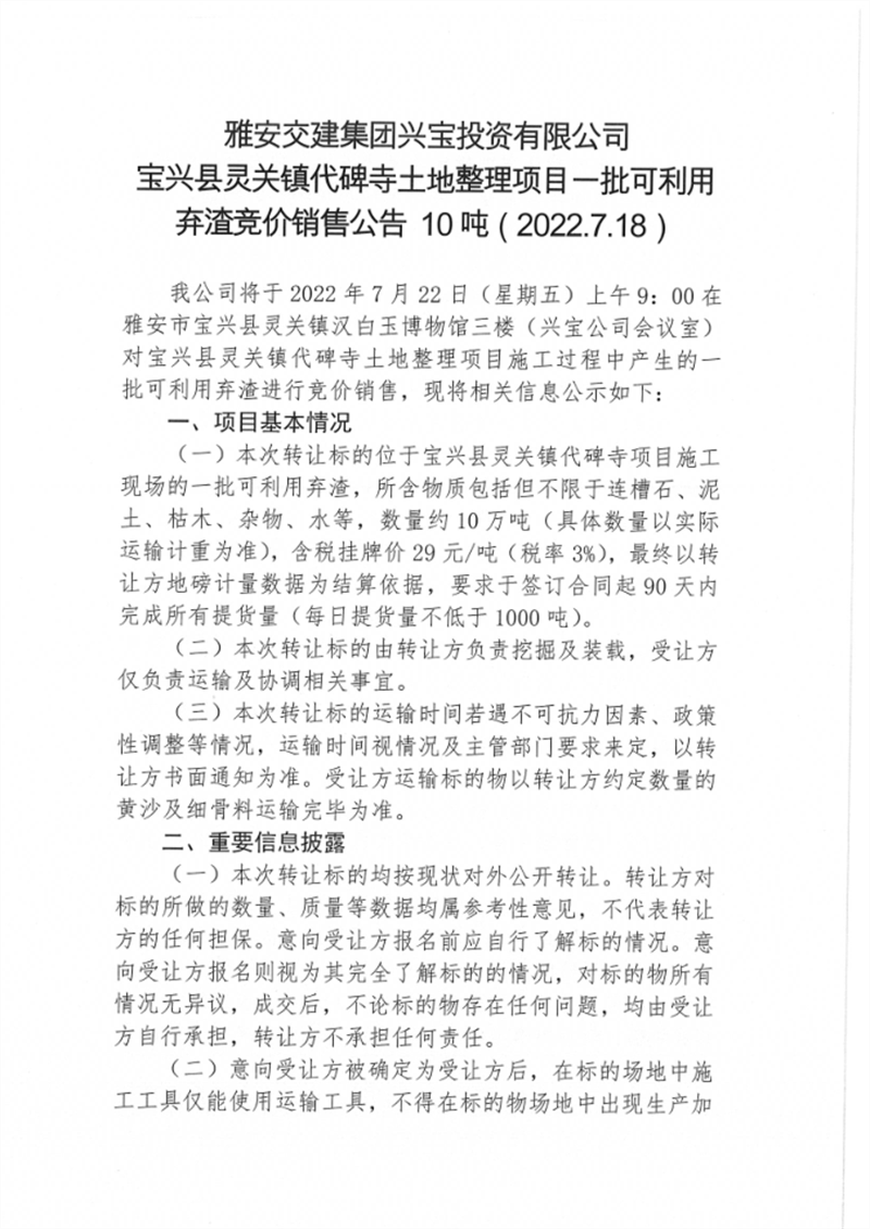 寶興縣靈關鎮(zhèn)代碑寺土地整理項目一批可利用棄渣競價銷售公告7.18(5萬噸)