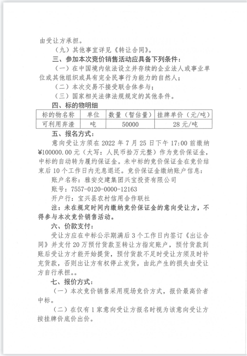 興寶公司寶興縣靈關(guān)鎮(zhèn)代碑寺土地整理項(xiàng)目10萬噸可利用棄渣競價銷售掛網(wǎng)公告掛網(wǎng)公告7.22(5萬噸)