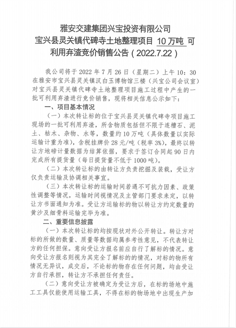 興寶公司寶興縣靈關鎮(zhèn)代碑寺土地整理項目10萬噸可利用棄渣競價銷售掛網公告掛網公告7.22(5萬噸)