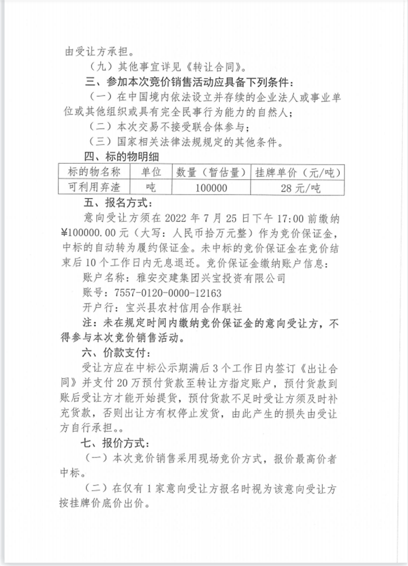 興寶公司寶興縣靈關鎮(zhèn)代碑寺土地整理項目10萬噸可利用棄渣競價銷售掛網公告7.22(10萬噸)