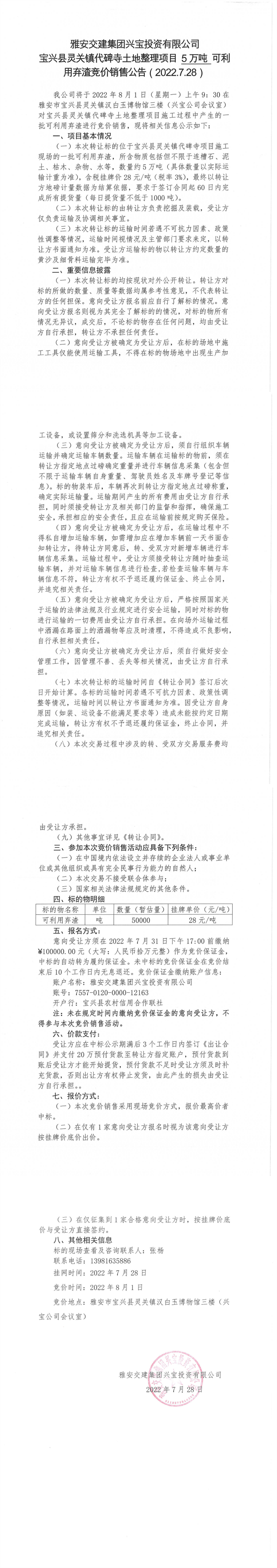 雅安交建集團興寶投資有限公司靈關(guān)鎮(zhèn)代碑寺土地整理項目5萬噸可利用棄渣競價銷售公告(2022.7.28)