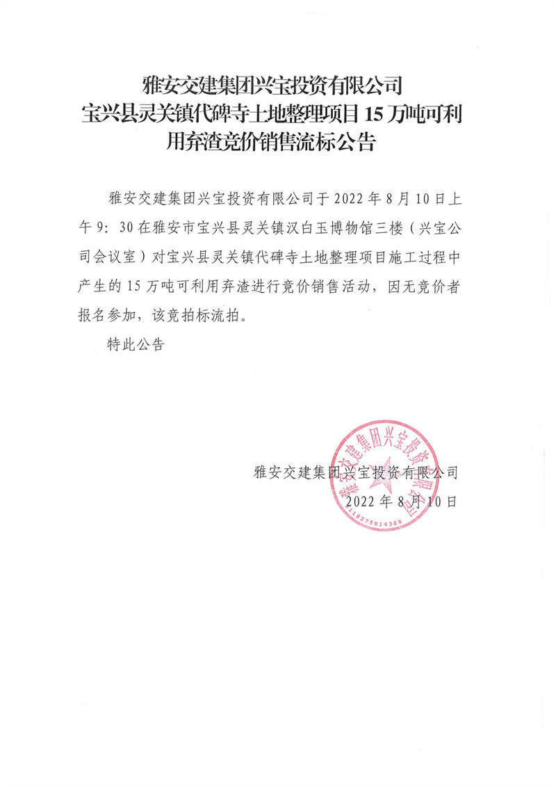 雅安交建集團興寶投資有限公司靈關(guān)鎮(zhèn)代碑寺土地整理項目15萬噸可利用棄渣競價銷售流標公告