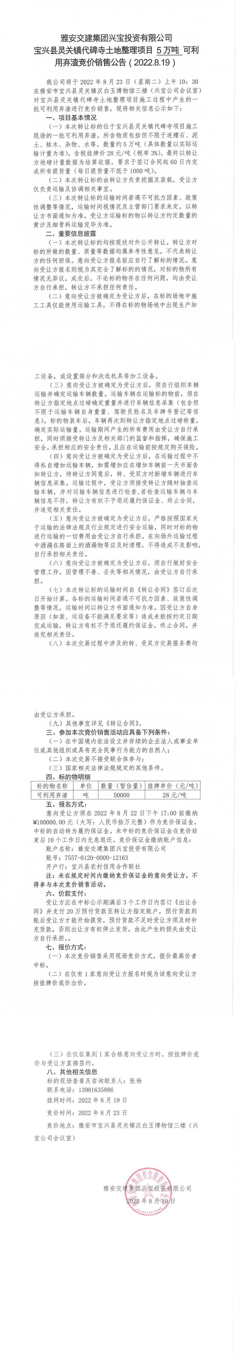 雅安交建集團(tuán)興寶投資有限公司靈關(guān)鎮(zhèn)代碑寺土地整理項(xiàng)目10萬噸可利用棄渣競(jìng)價(jià)銷售公告(2022.8.19)(1)