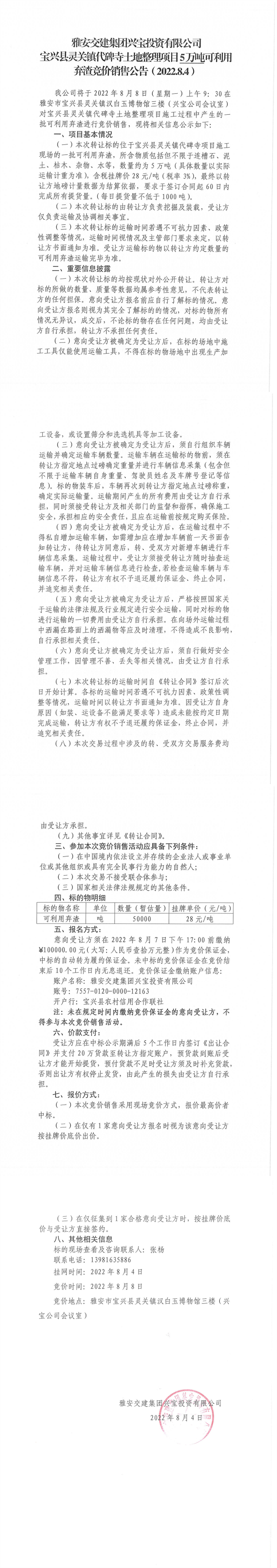 雅安交建集團興寶投資有限公司靈關(guān)鎮(zhèn)代碑寺土地整理項目5萬噸可利用棄渣競價銷售公告(2022.8.4)