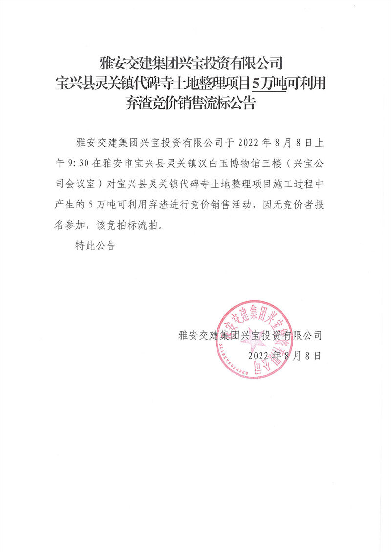代碑寺土地整理項(xiàng)目5萬噸可利用棄渣競(jìng)價(jià)銷售流標(biāo)公告