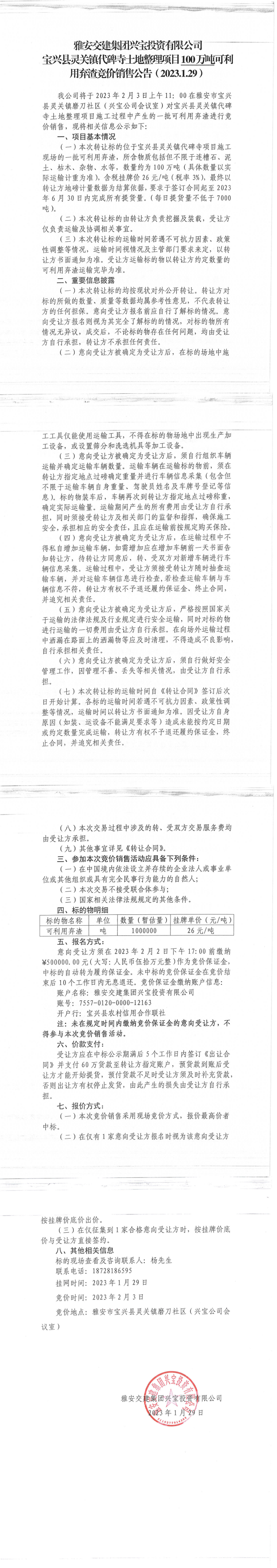 雅安交建集團(tuán)興寶投資有限公司靈關(guān)鎮(zhèn)代碑寺土地整理項(xiàng)目100萬噸可利用棄渣競(jìng)價(jià)銷售公告(2023.1.29)