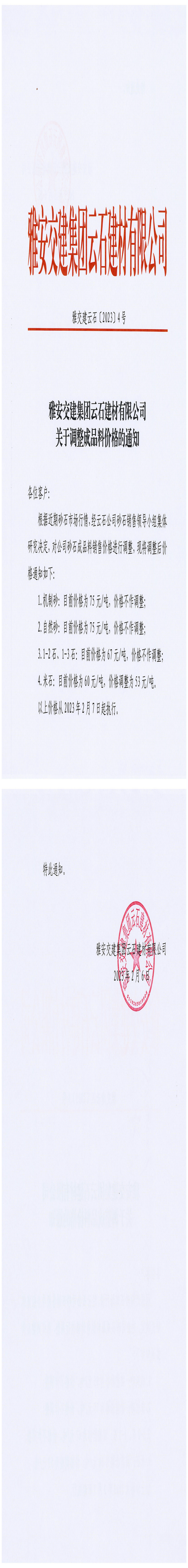 雅安交建集團云石建材有限公司關(guān)于調(diào)整成品料價格的通知-2023-02-06