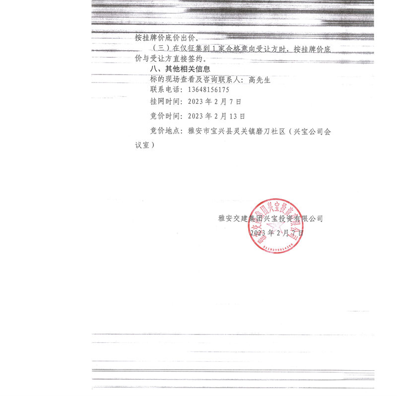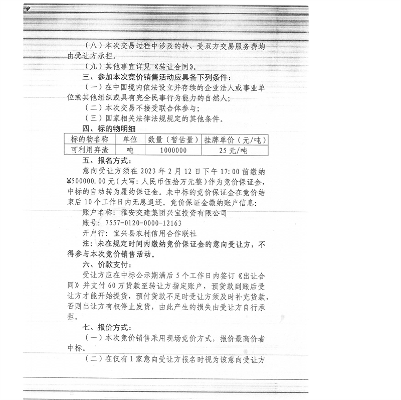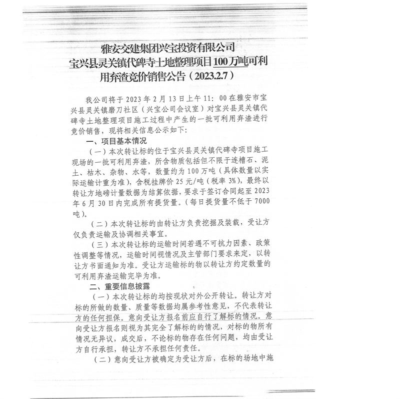 雅安交建集團(tuán)興寶投資有限公司100萬(wàn)噸可利用棄渣競(jìng)價(jià)銷(xiāo)售流標(biāo)公告(2023.2.13)