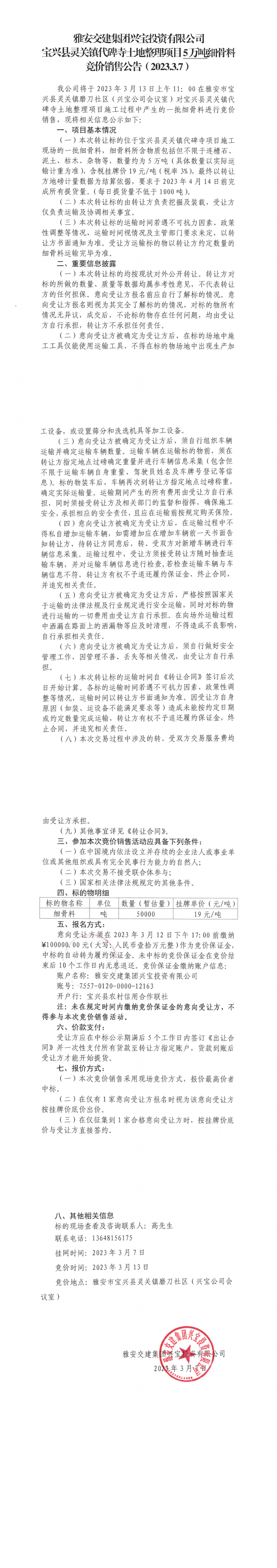 雅安交建集團興寶投資有限公司寶興縣靈關(guān)鎮(zhèn)代碑寺土地整理項目5萬噸細骨料競價銷售公告(2023.3.7)