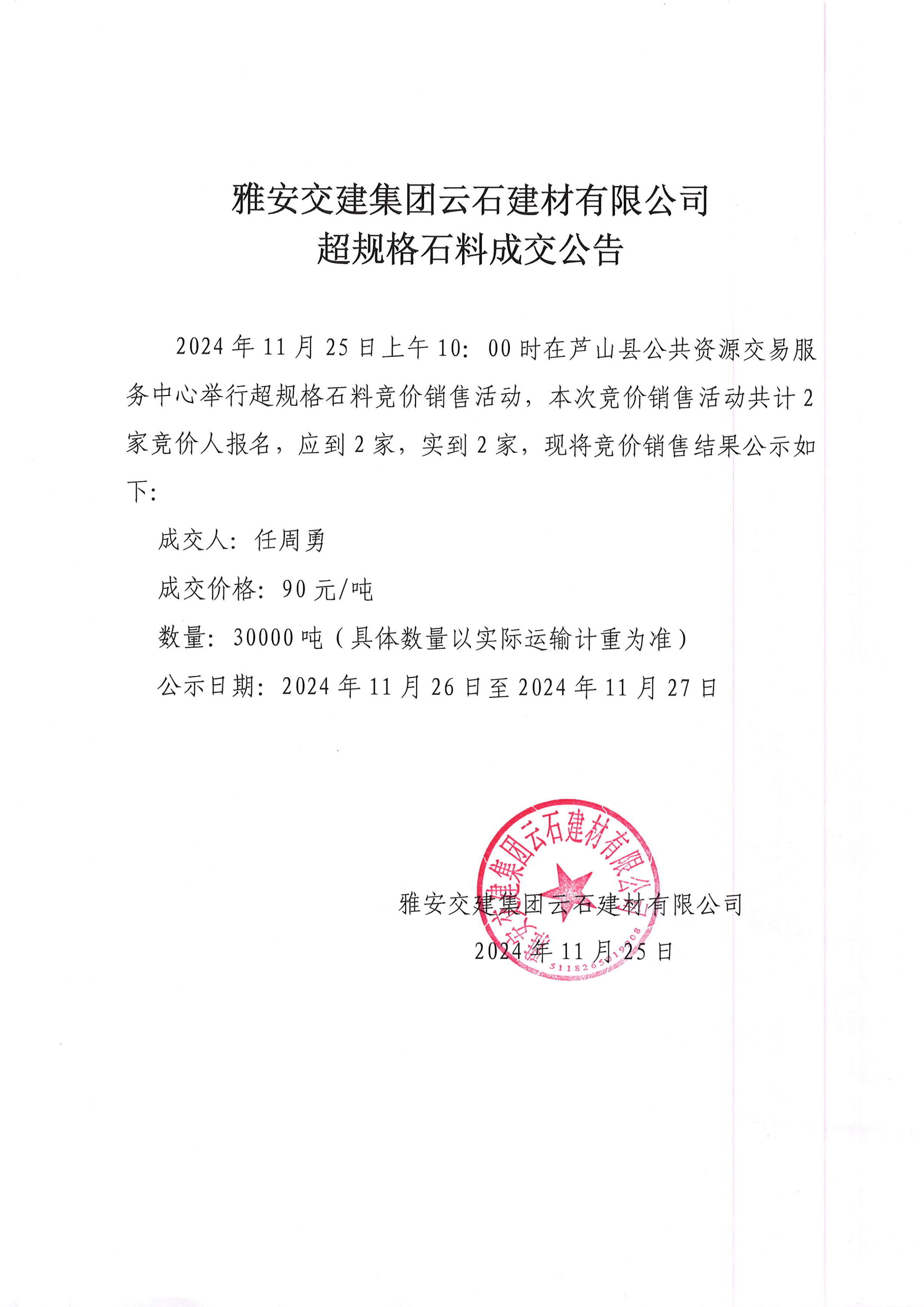 雅安交建集團(tuán)云石建材有限公司超規(guī)格石料競(jìng)價(jià)銷售成交公告(2024-11-26)