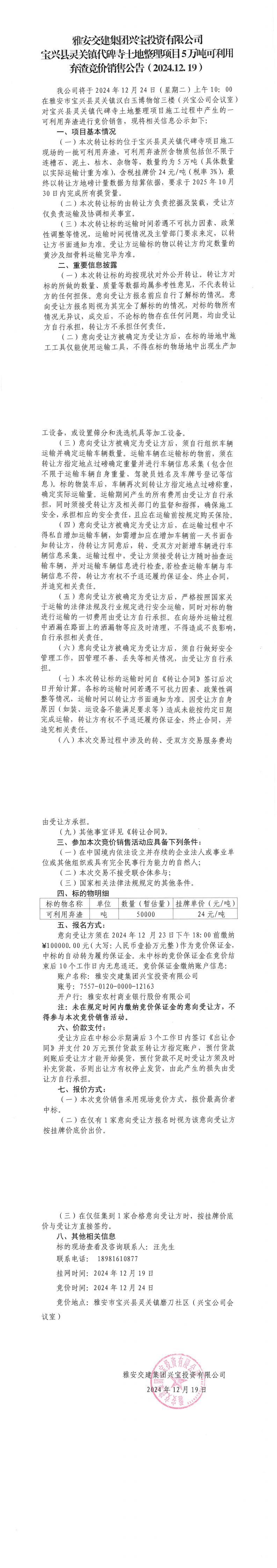 雅安交建集團興寶投資有限公司靈關(guān)鎮(zhèn)代碑寺土地整理項目5萬噸可利用棄渣競價銷售公告(2024.12.19)
