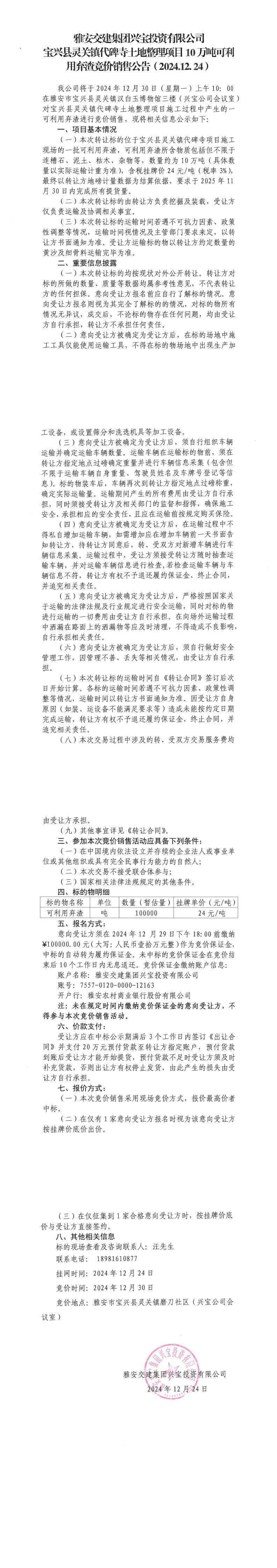 雅安交建集團(tuán)興寶投資有限公司靈關(guān)鎮(zhèn)代碑寺土地整理項目10萬噸可利用棄渣競價銷售公告(2024.12.24)
