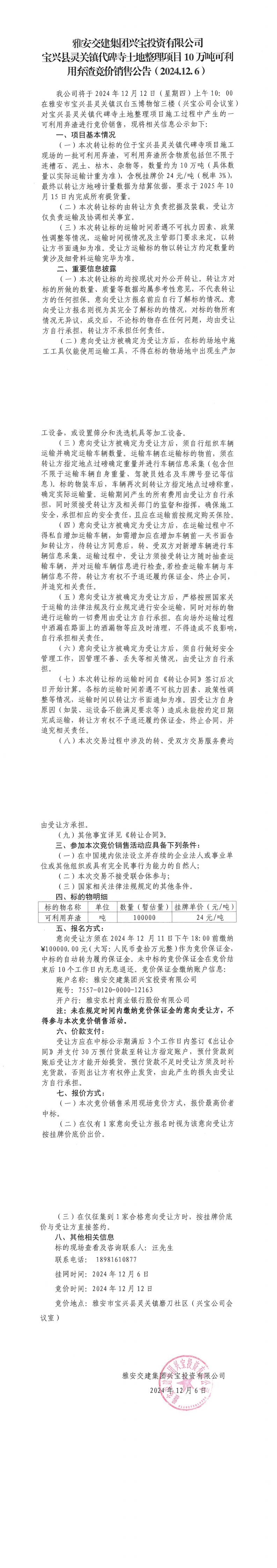 雅安交建集團興寶投資有限公司靈關(guān)鎮(zhèn)代碑寺土地整理項目10萬噸可利用棄渣競價銷售公告(2024.12.06)