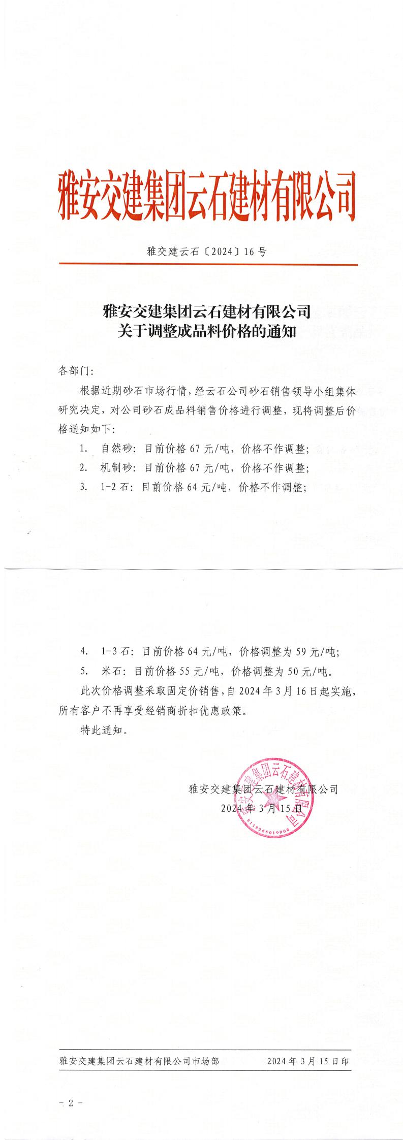 ÑŰ²½»½¨¼¯ˆF(tu¨¢n)ÔÆÊ¯½¨²ÄÓÐÏÞ¹«Ë¾³ÉÆ·Áσr(ji¨¤)¸ñÕ{(di¨¤o)Õû¹«¸æ£¨2024-2-21£©