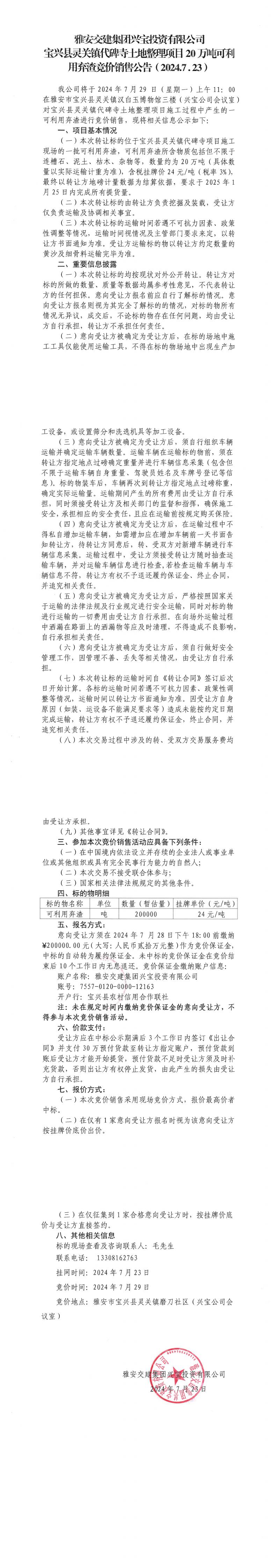 雅安交建集團(tuán)興寶投資有限公司靈關(guān)鎮(zhèn)代碑寺土地整理項(xiàng)目20萬(wàn)噸可利用棄渣競(jìng)價(jià)銷售公告(2024.7.23)