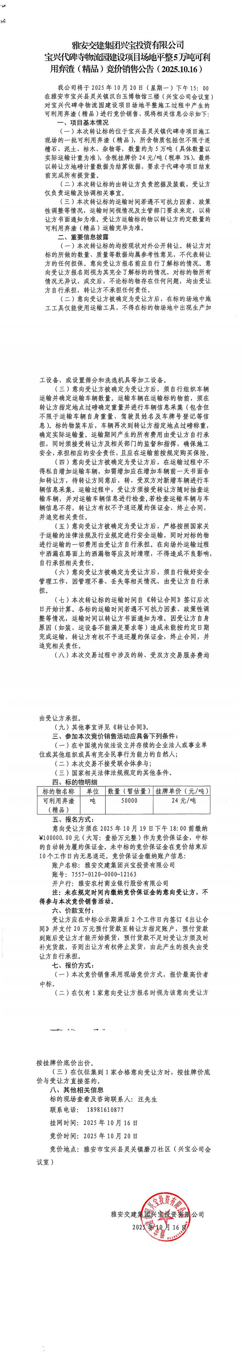 雅安交建集團興寶投資有限公司寶興代碑寺物流園建設(shè)項目場地平整5萬噸可利用棄渣(精品)競價銷售公告(2025.10.16)
