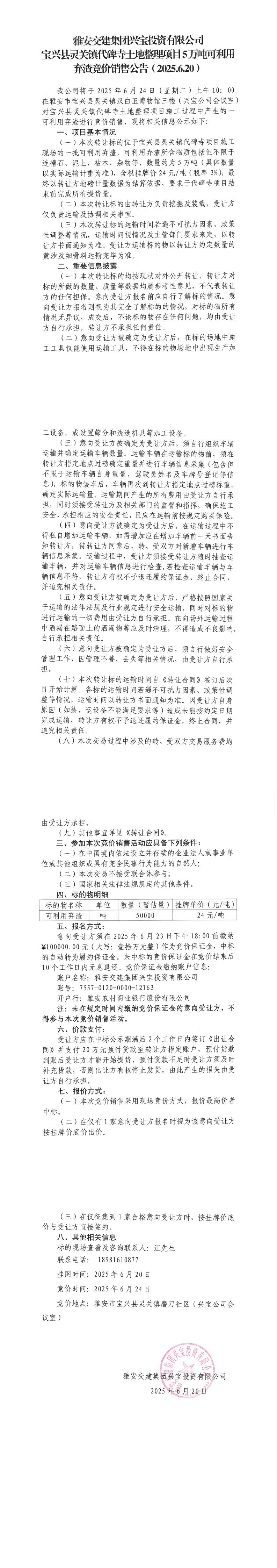 雅安交建集團(tuán)興寶投資有限公司寶興縣靈關(guān)鎮(zhèn)代碑寺土地整理項(xiàng)目10萬噸可利用棄渣競(jìng)價(jià)銷售公告
